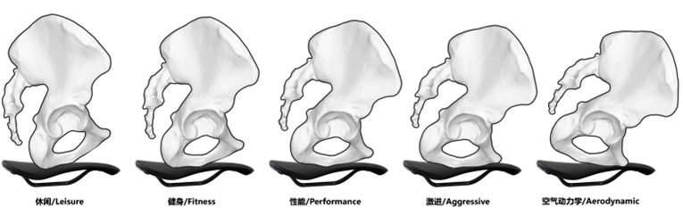获得骑手的坐骨宽度(如 110 mm、120 mm 等)后,需要结合其实际骑行姿势(背部前倾角度)来推荐合适的坐垫宽度。不同骑行姿势下骨盆旋转角度不同,坐骨在坐垫上的受力情况也发生变化,从而影响理想坐垫宽度的计算。一般而言,我们会在测得的坐骨间距基础上加上一定裕量,以确保坐骨完全落在坐垫受力区内、不悬空压迫软组织。一个常用的经验值是加约20~30毫米左右。例如,坐骨宽度130 mm的骑手通常适合约150~160 mm宽的坐垫。然而,这个加值并非固定不变,而是随着骑行姿势变化:背部越前倾(竞技/气动姿势),骨盆越向前旋转,坐骨接触面积相对减小且更靠近耻骨,所需加宽值就越小;反之,背部越直立(休闲骑行),坐骨完全承担体重,所需坐垫宽度加值应更大。